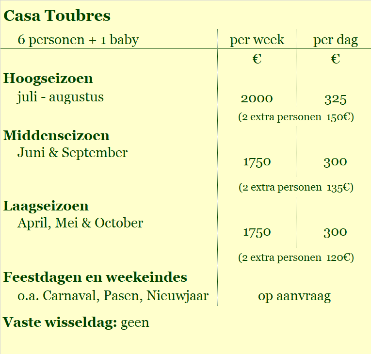 - De minimum-verblijfsduur in het hoogseizoen is 1 week en in de rest van het jaar 4 dagen.