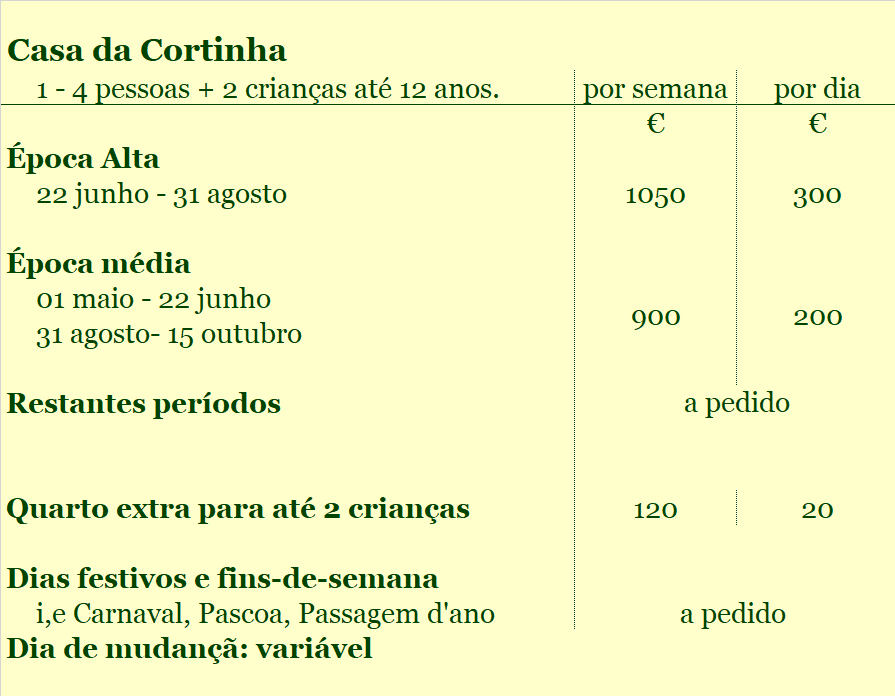 Nos arredores da vila fica a Casa da Cortinha, uma fazenda maravilhosamente restaurada construída com blocos de granito. A parede externa um tanto simples esconde um interior surpreendente. Você entra em um vasto salão que no outono serve como uma pequena adega. Uma ampla escada leva ao andar superior, onde estão situadas a sala de estar, cozinha e 2 quartos. O que chama a atenção imediatamente é o fogão azul, que tem uma parte a lenha, e outra parte a gás. Pela sala, você entra na varanda, onde pode saborear seu café da manhã ao sol da manhã, além de uma vista maravilhosa sobre o vale e as terras altas de Trás-os-Montes.